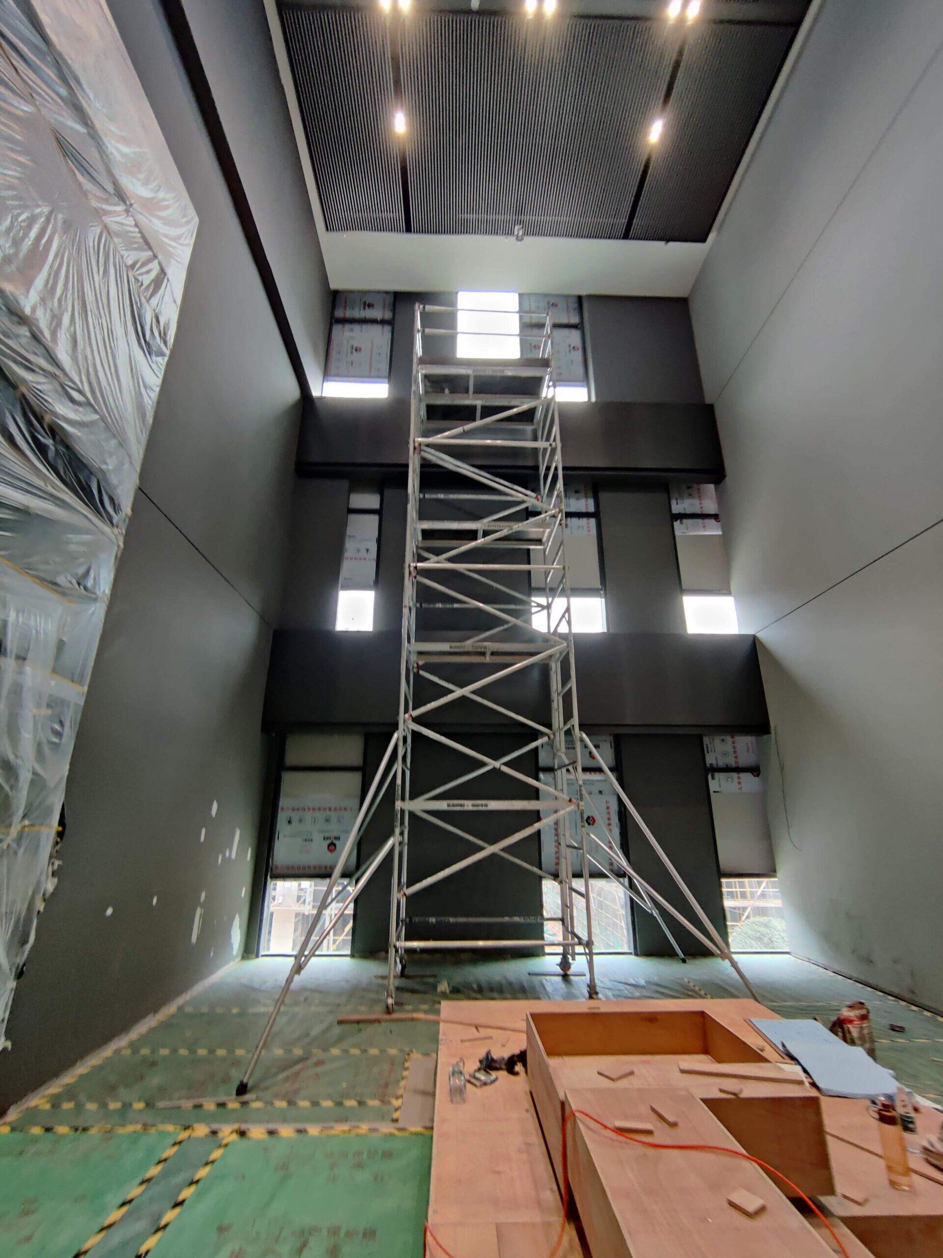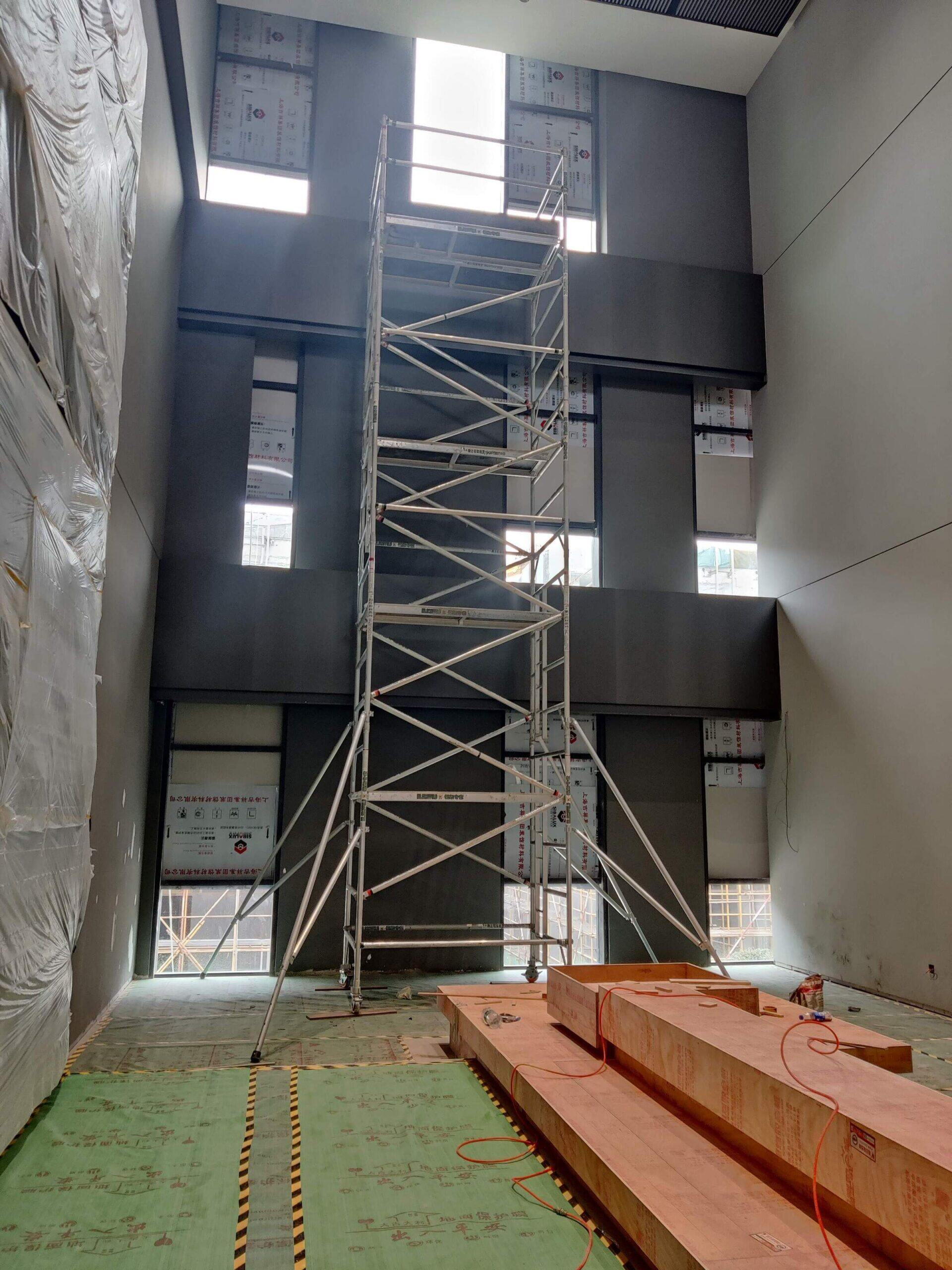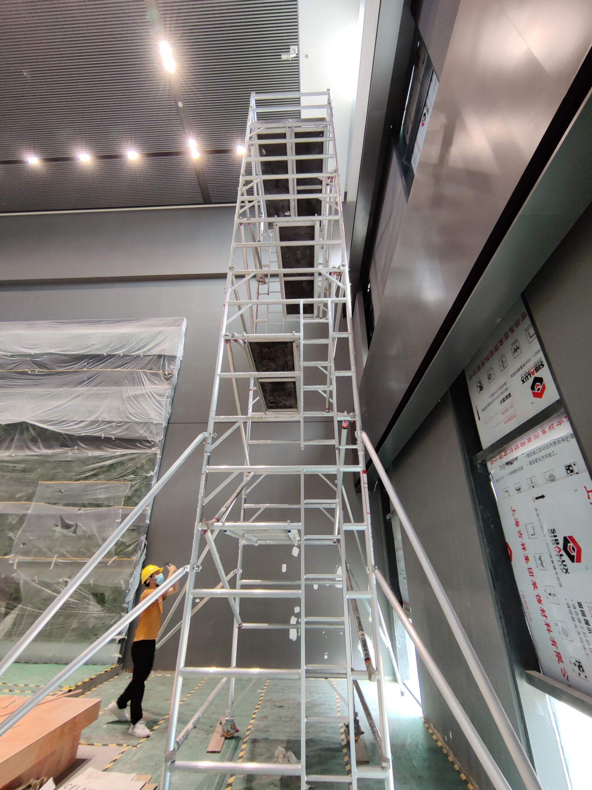 深圳国际会展中心是深圳市委市政府投资建设的重大项目,由招商蛇口和华侨城联合体负责建设运营,是集展览、会议、活动(赛事、演艺等)、餐饮、购物、办公、服务等于一体的超大型会展综合体。 施工项目是要在会场中安装吊灯,高度14m,需要用带斜撑,符合住建局标准的脚手架。 为解决楼层安装吊顶问题,梯架易为其提供双宽可移动铝合金脚手架,搭设过程耗时短暂,安装方便,结构稳固,质量轻便,无其他小散零部件,全面解决了搭设困难,质量笨重且人力成本过高等问题。支撑力强劲,有力保障施工者的安全,带刹车重型万向脚轮,方便在会场中移动安装吊灯,省时省力。