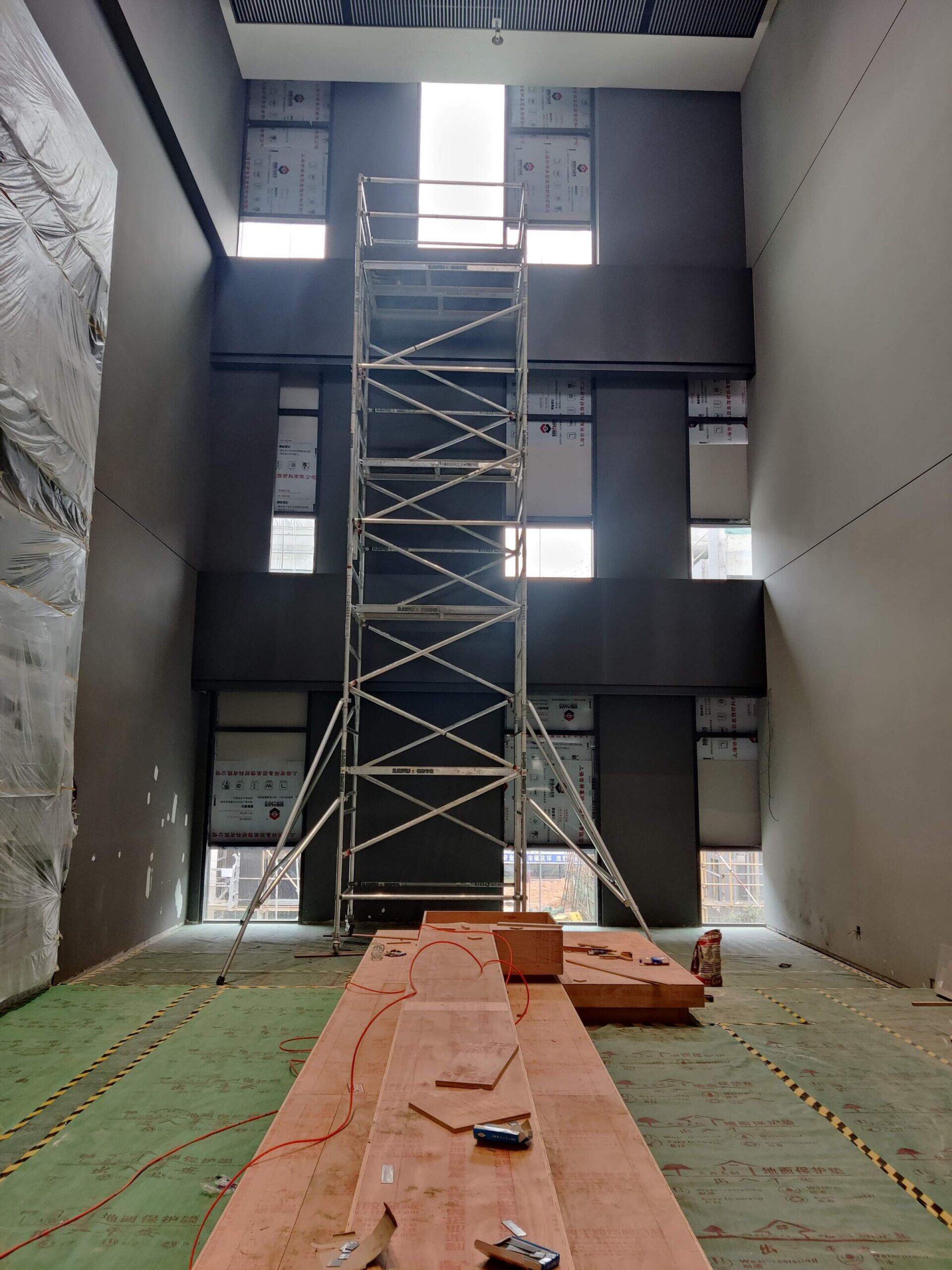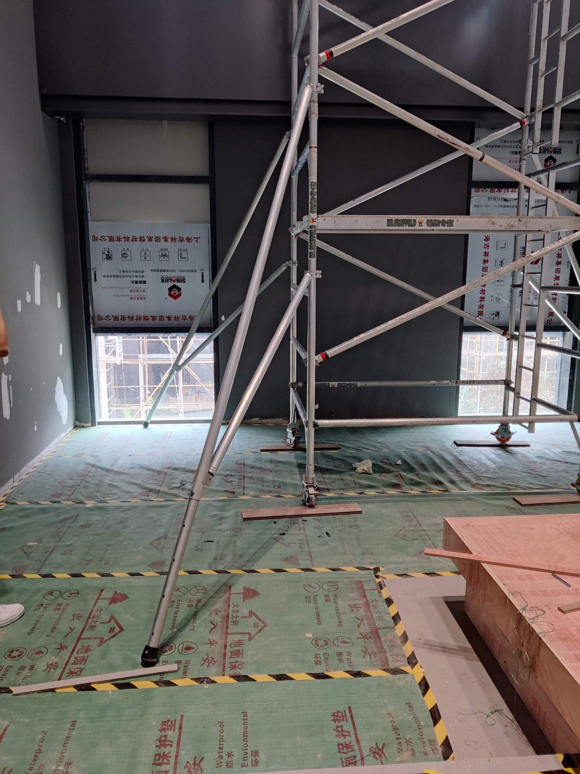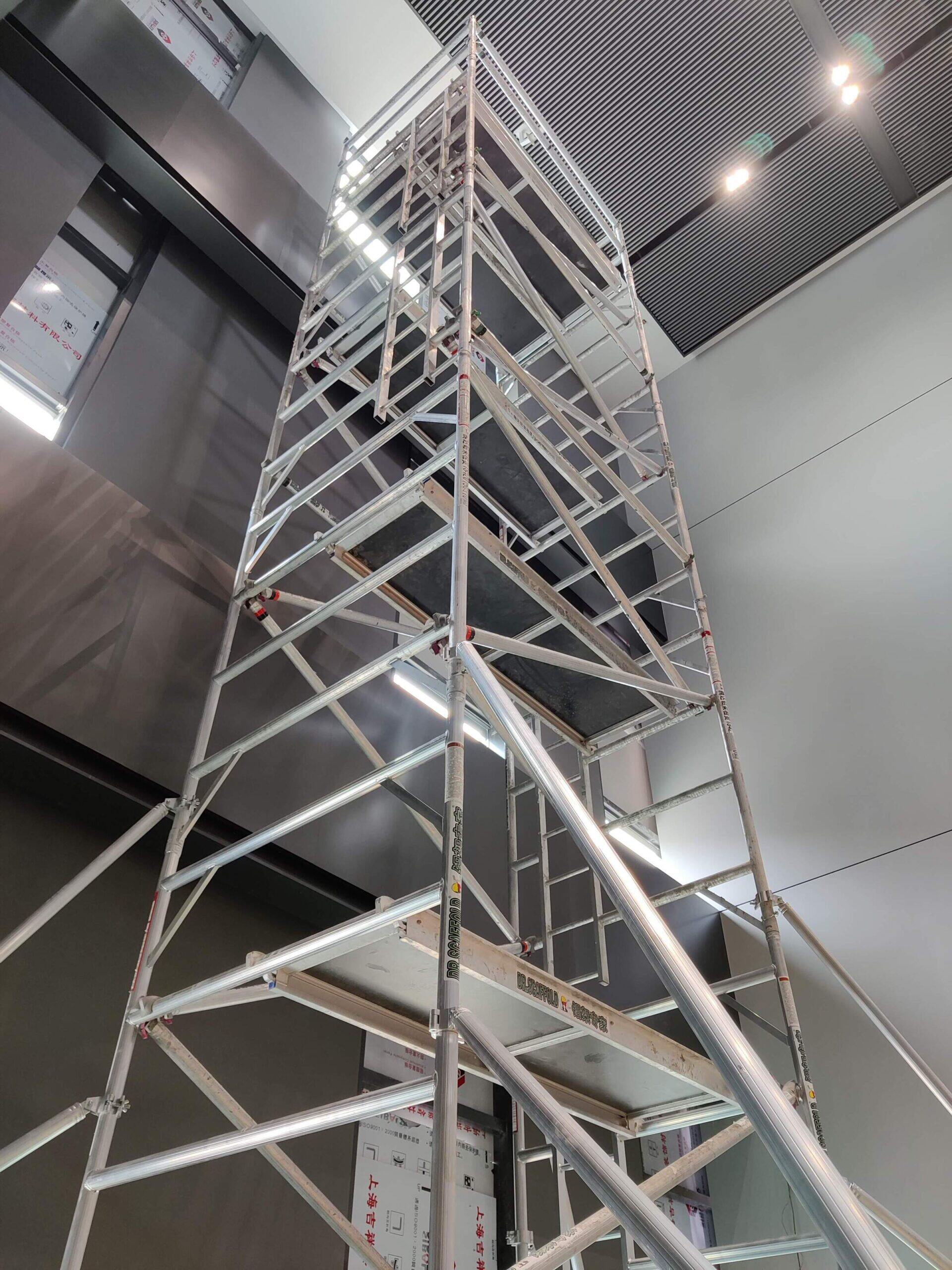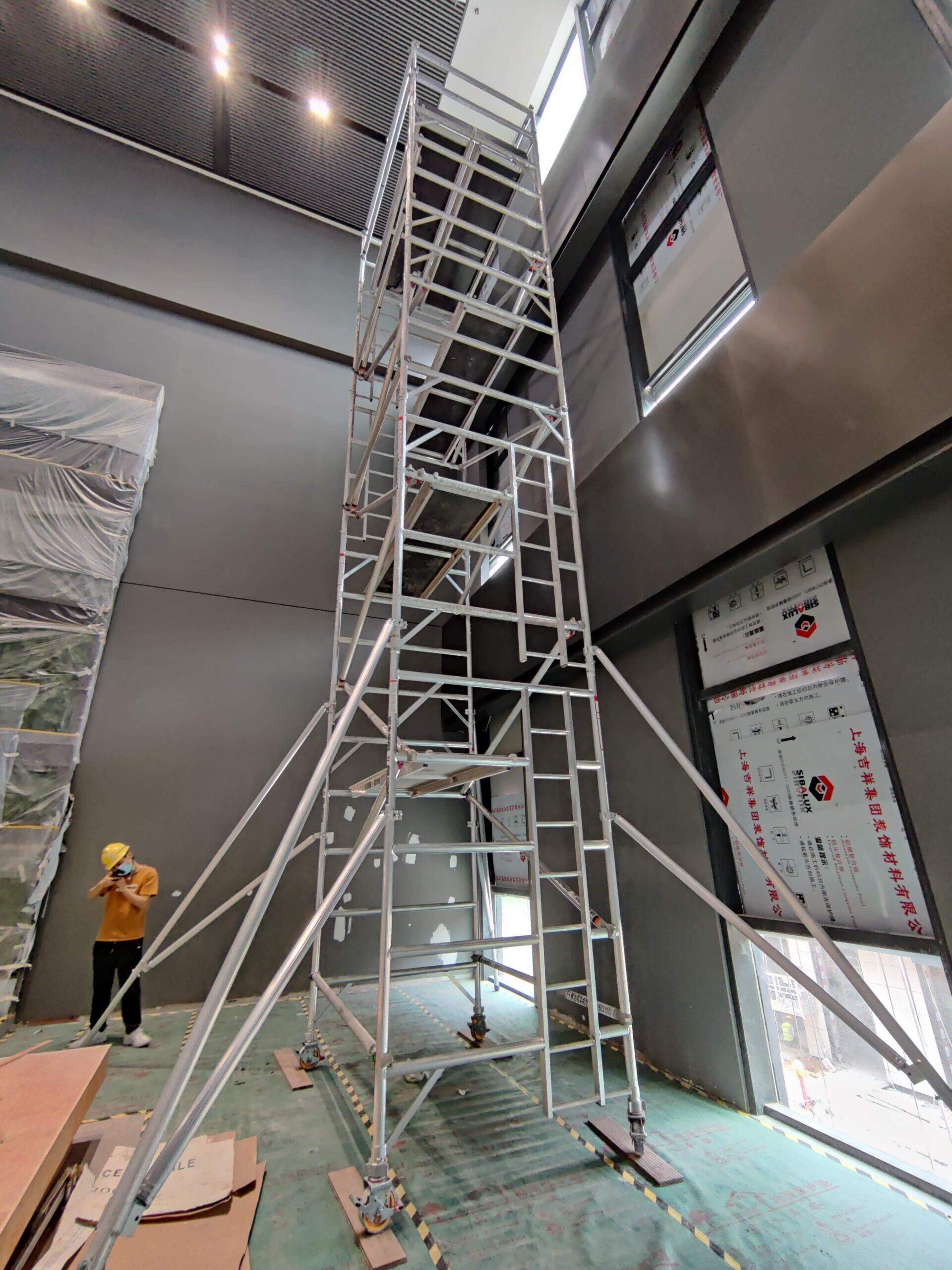 为解决楼层安装吊顶问题,梯架易为其提供双宽可移动铝合金脚手架,搭设过程耗时短暂,安装方便,结构稳固,质量轻便,无其他小散零部件,全面解决了搭设困难,质量笨重且人力成本过高等问题。支撑力强劲,有力保障施工者的安全,带刹车重型万向脚轮,方便在会场中移动安装吊灯,省时省力。