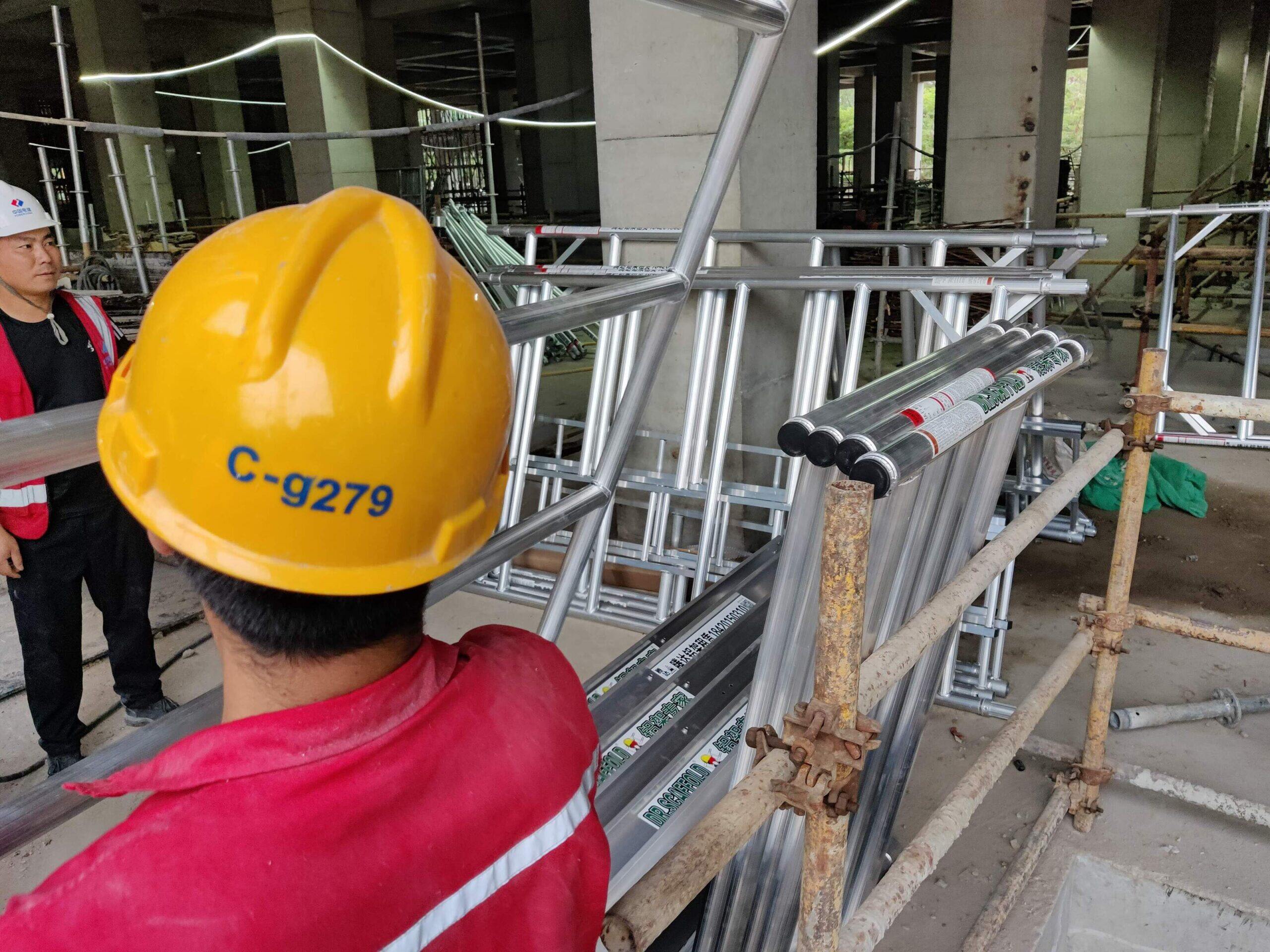 深圳市福海中学,由宝安第一外国语学校引领建设,位于宝安区福海街道,是深圳市委市政府“高起点、高规格、高标准”打造的一所现代化全寄宿制公办高中。梯架易提供12米铝合金脚手架进行中央空调维修,利用轮子对不同位置的空调进行检修