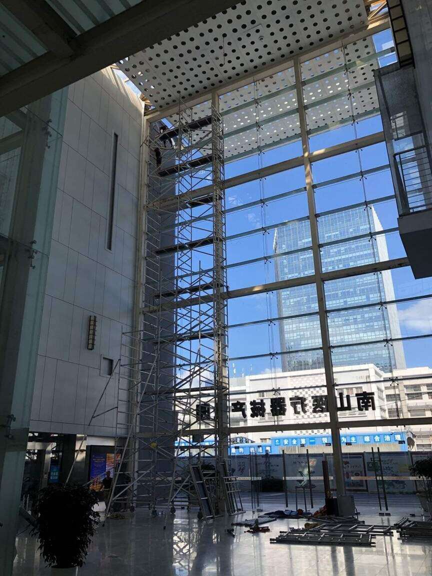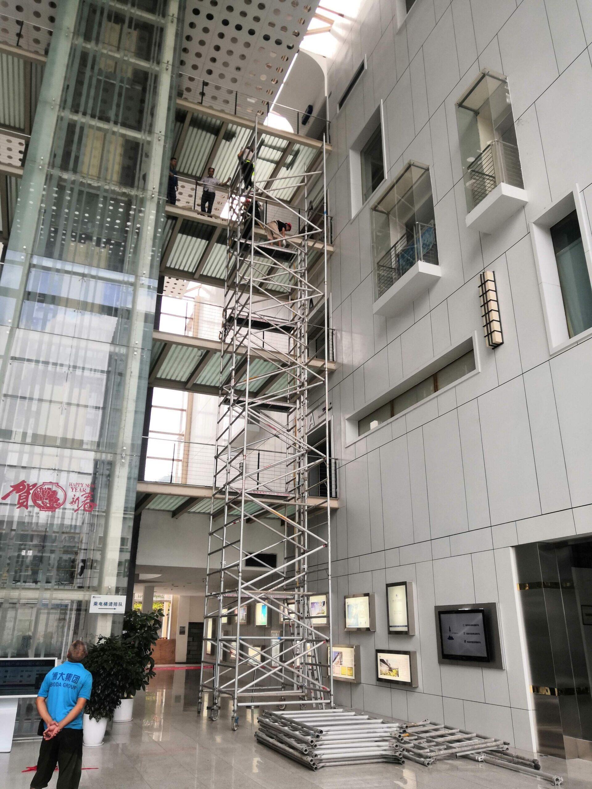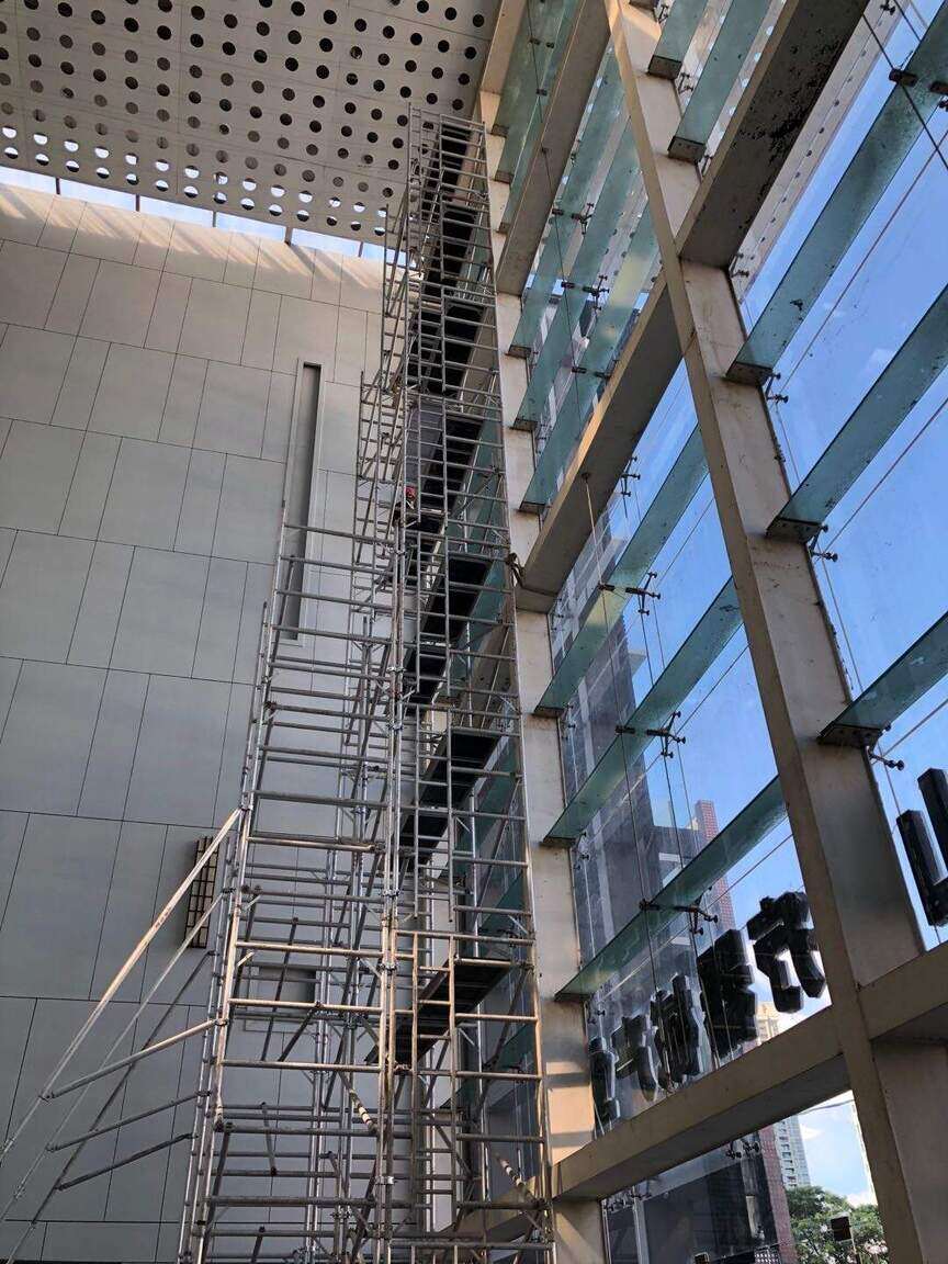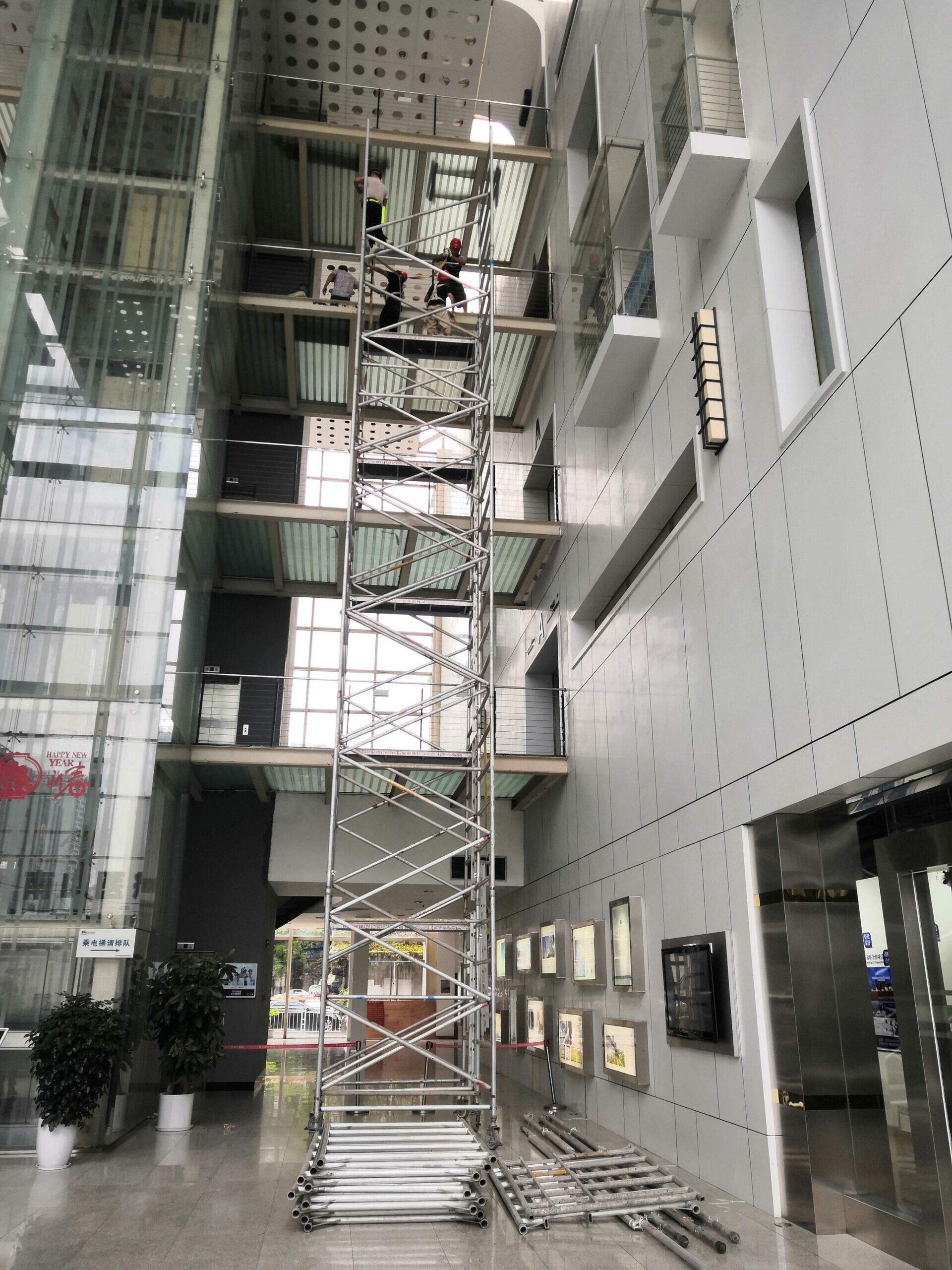 深圳市福海中学,由宝安第一外国语学校引领建设,位于宝安区福海街道,是深圳市委市政府“高起点、高规格、高标准”打造的一所现代化全寄宿制公办高中。梯架易提供12米铝合金脚手架进行中央空调维修,利用轮子对不同位置的空调进行检修