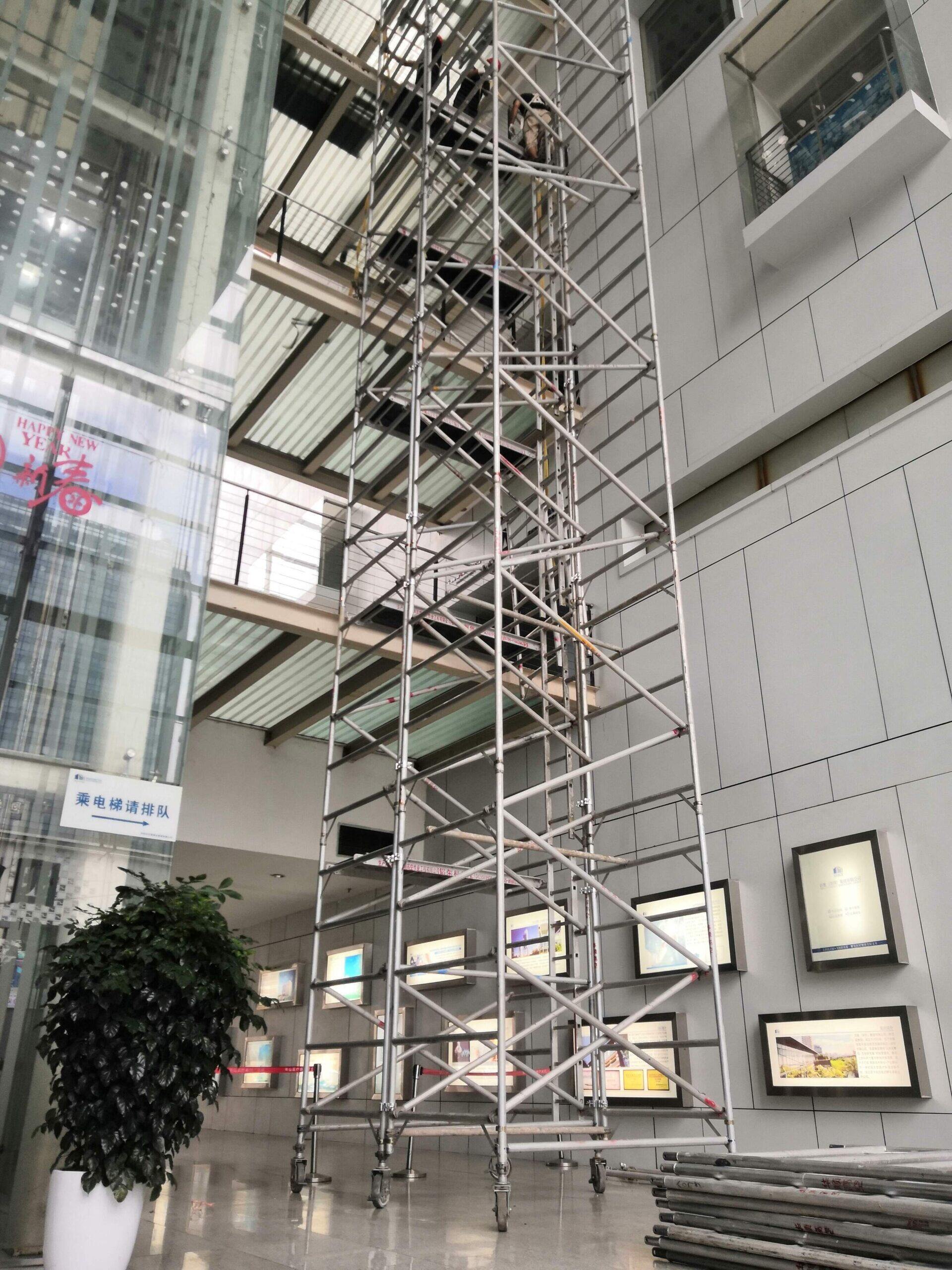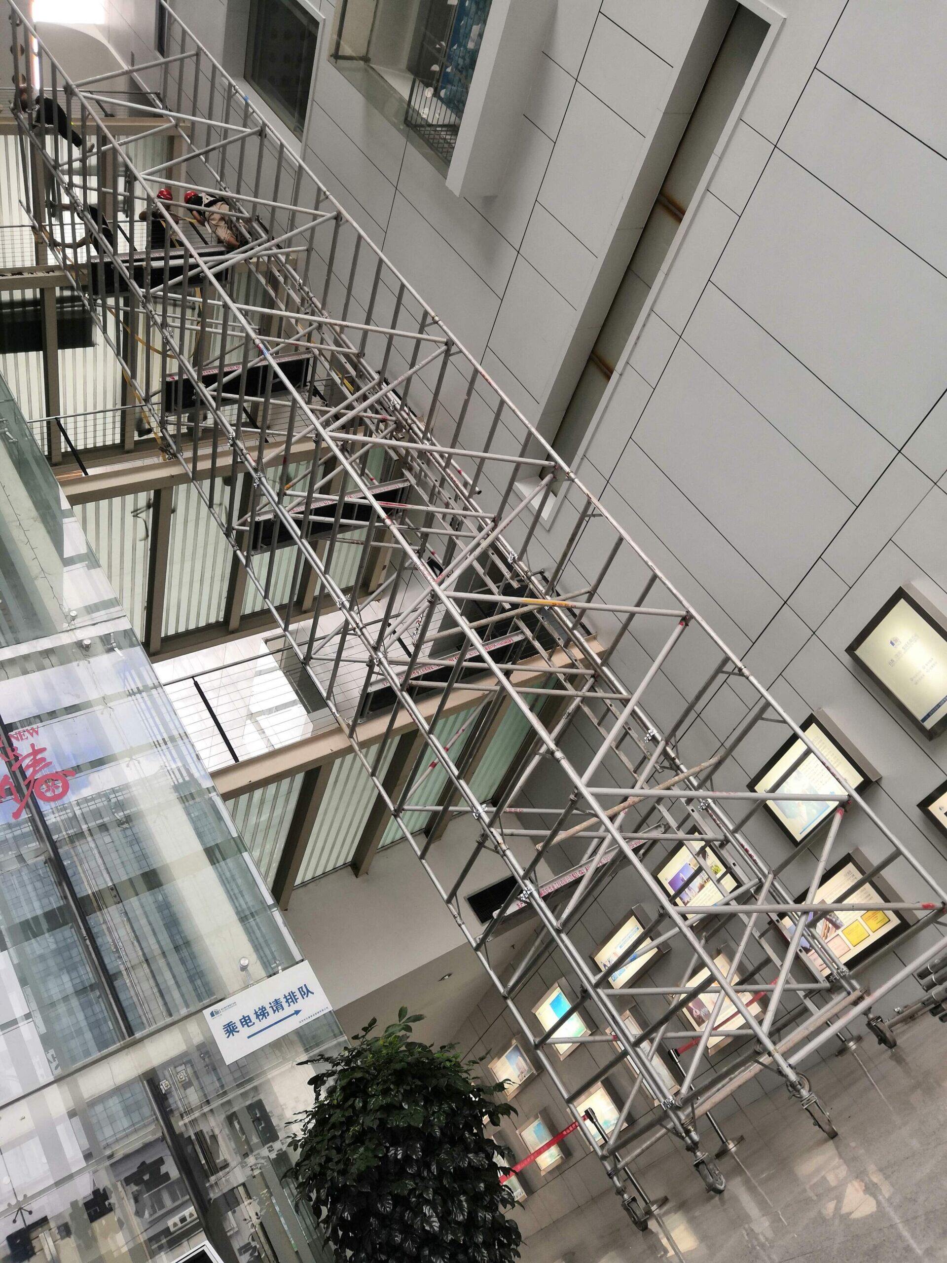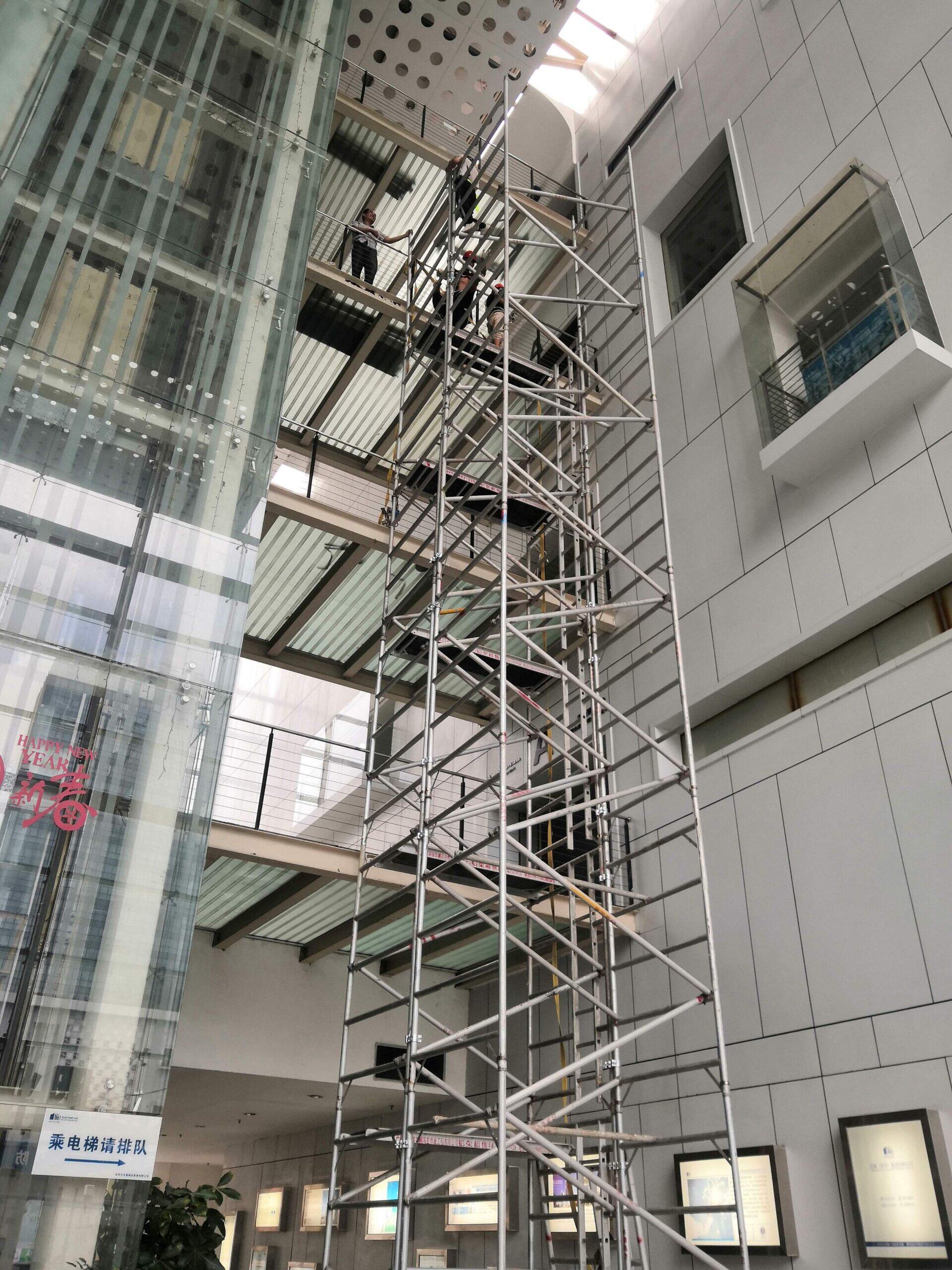 立桥金融中心需要修整,由于靠近楼梯和不规则空间,我司采有铝合金盘扣脚手架进行搭建