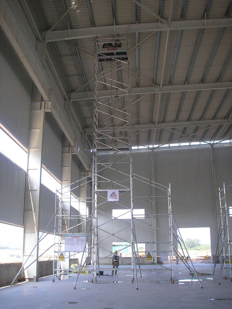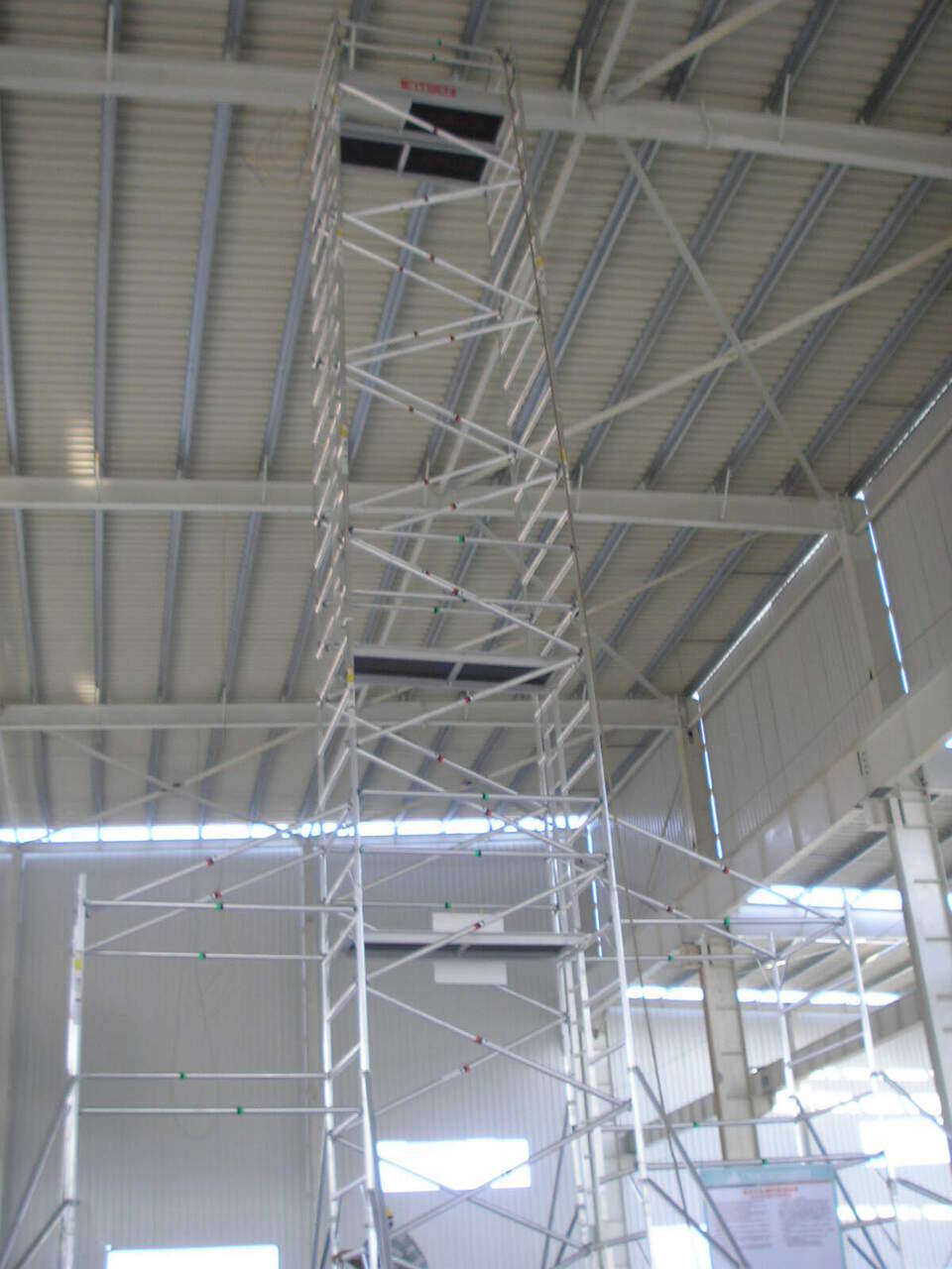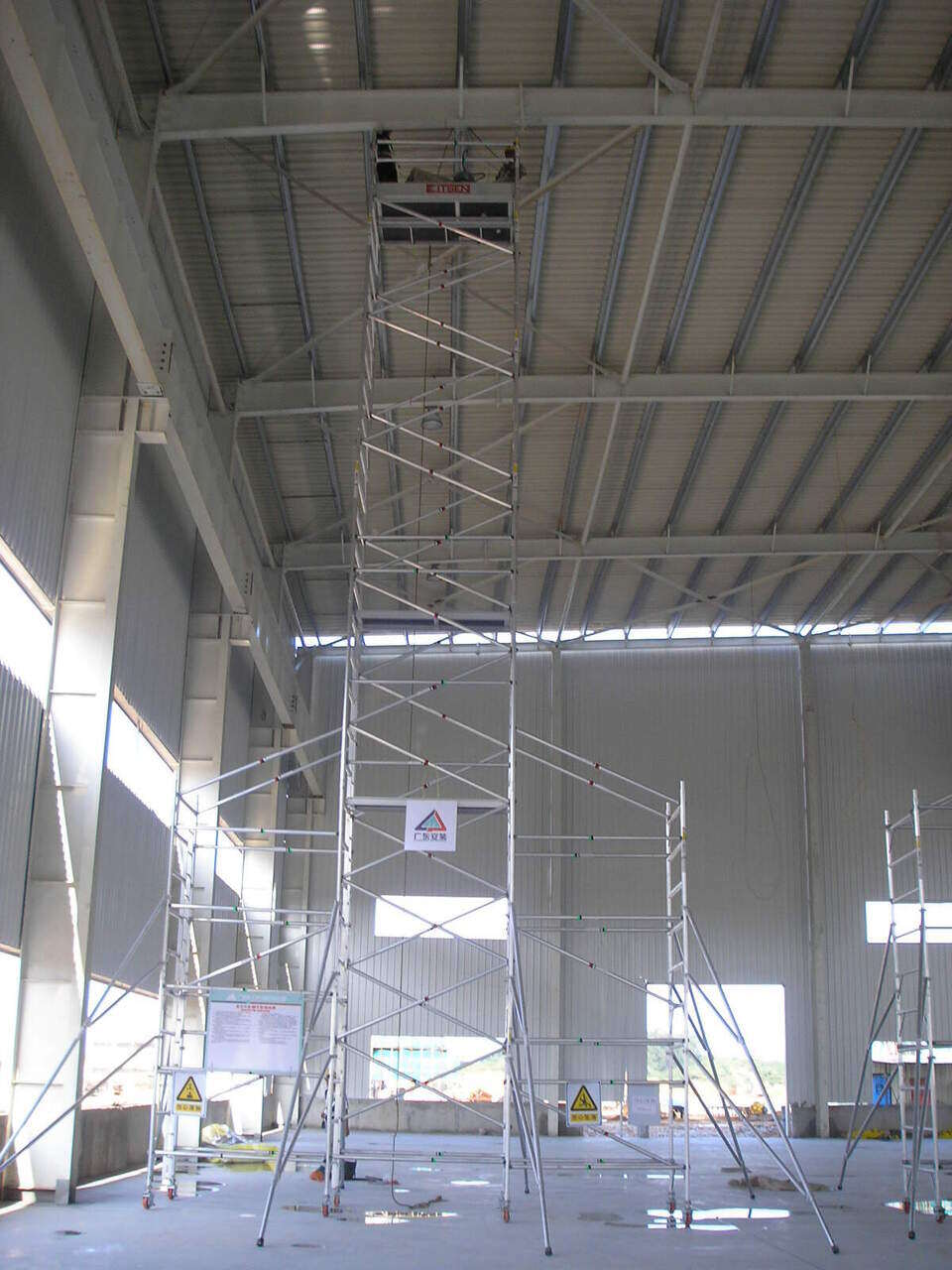 为解决屋顶维修问题,梯架易为其提供多组双宽可移动铝合金脚手架,选用主架+副架方案进行搭建,针对14m的高度,选择2个副架和斜撑作为稳固点,全方位加固,由于是铝合金型材为材料制作而成,所以重量很轻,搬运和搭建都不耗人力,运输方面也十分方便。仅用了几个小时便搭建而成,快速开展工作,全面解决了搭设困难,质量笨重且人力成本过高等问题。支撑力强劲,有力保障施工者的安全,带刹车重型万向脚轮,方便在会场中移动,多地点使用,省时省力。