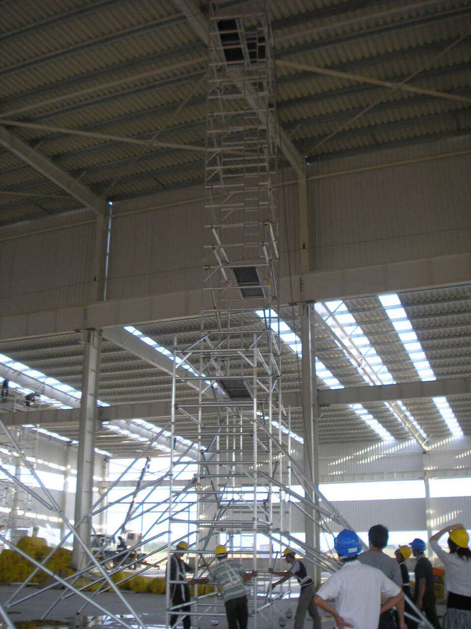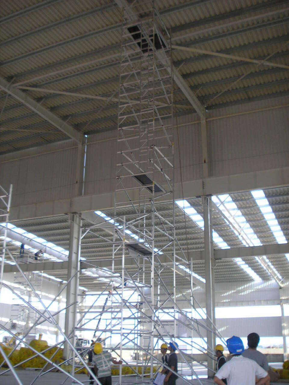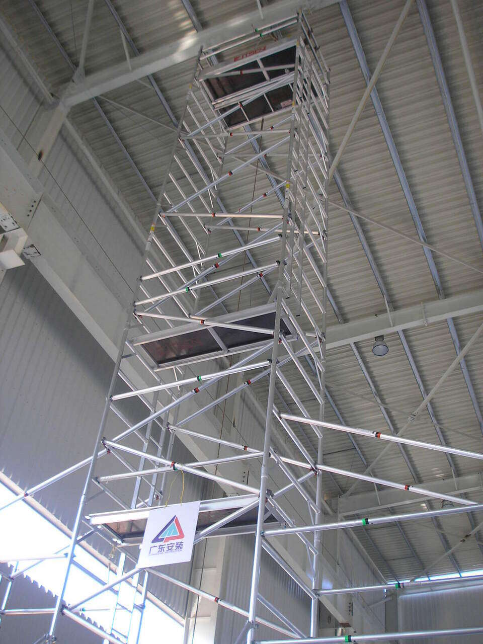 为解决屋顶维修问题,梯架易为其提供多组双宽可移动铝合金脚手架,选用主架+副架方案进行搭建,针对14m的高度,选择2个副架和斜撑作为稳固点,全方位加固,由于是铝合金型材为材料制作而成,所以重量很轻,搬运和搭建都不耗人力,运输方面也十分方便。仅用了几个小时便搭建而成,快速开展工作,全面解决了搭设困难,质量笨重且人力成本过高等问题。支撑力强劲,有力保障施工者的安全,带刹车重型万向脚轮,方便在会场中移动,多地点使用,省时省力。