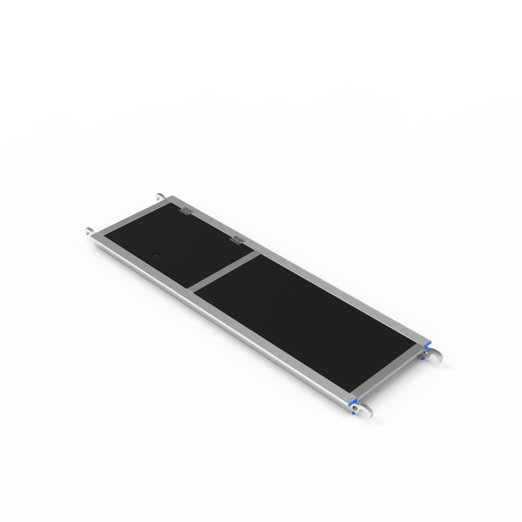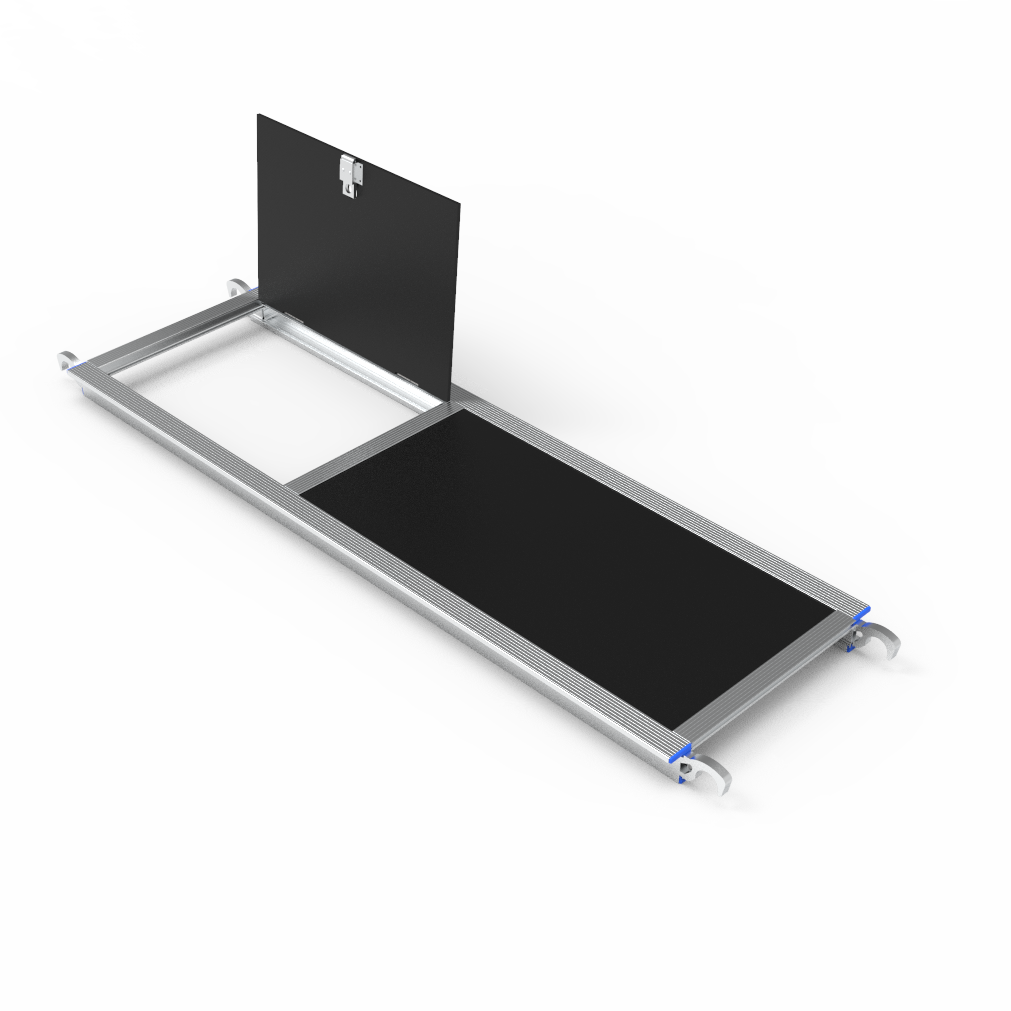 DR.SCAFFOLD®品牌铝合金脚手架开窗式踏板PTP1 2000*610mm(Trapdoor Platform 2.0m)-适用于双宽/单宽铝合金脚手架,带有舱口甲板的踏板允许施工人员更加便捷地进入脚手架项目,需要对您的工作平台的某些特定位置进行唯一且安全的访问。铰接式舱口踏板提供了内部通道。 采用铝合金框架与防滑木板铆装组合,挂钩设计,端钩对角两处设有防风锁头,踏板采用开口设计,灵活攀爬,操作方便而安全,工作平台每平方平均承载力可达200公斤。